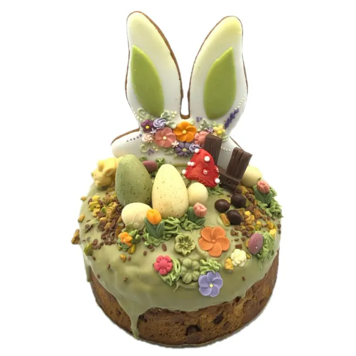 Nossa deliciosa massa de colomba com sabor de laranja com pistache, coberta com chocolate branco e pistache,