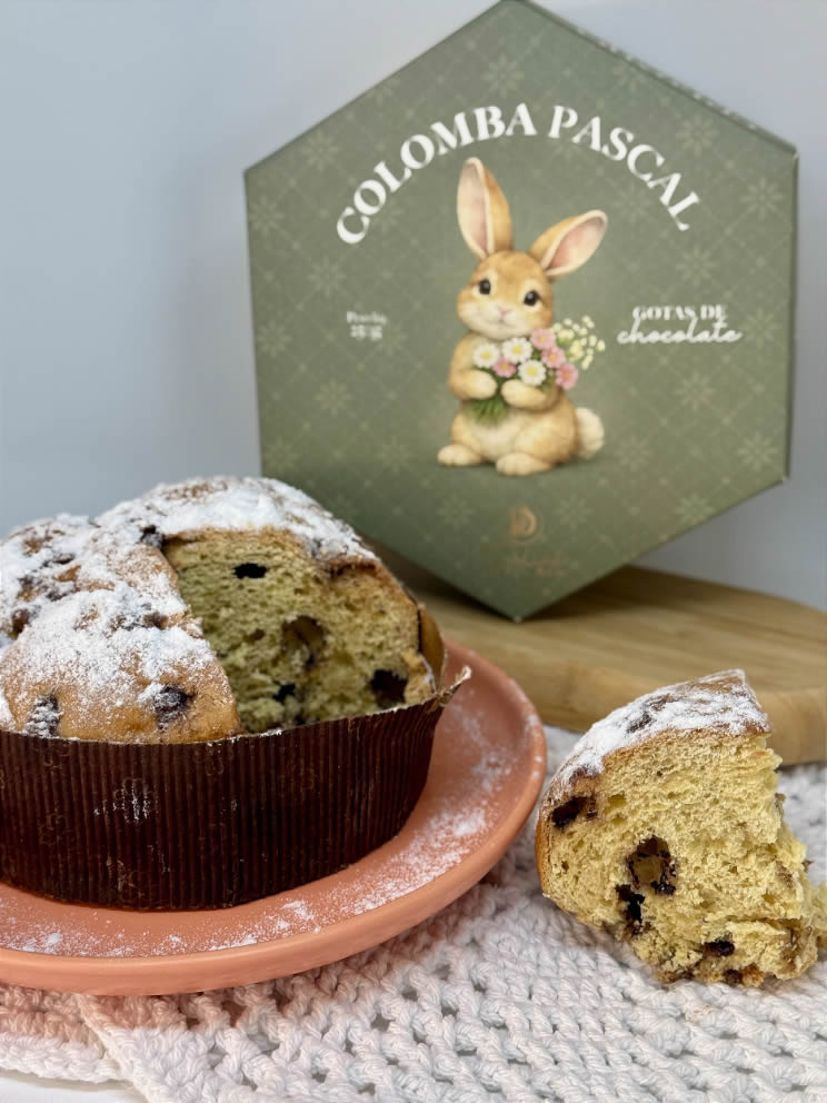 Tradicional Colomba Pascal macia e saborosa, preparada com cuidado para tornar a Páscoa ainda mais especial. A embalagem em caixa com estampa delicada valoriza o produto e transforma cada unidade em uma linda opção para presentear.